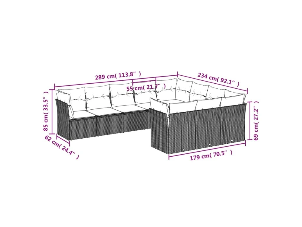 - Celkové rozměry pohovky: 289 x 234 x 69 cm (Š x H x V)