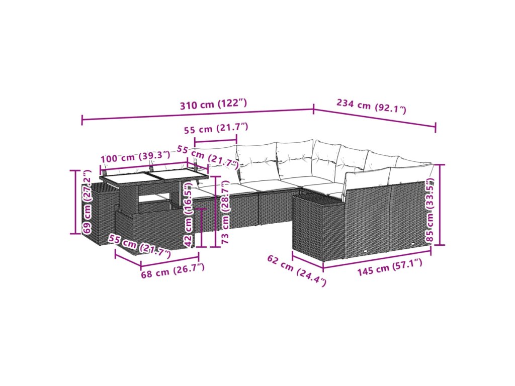 Tato zahradní sedací souprava je dokonalým doplňkem vaší zahrady, terasy nebo dvorku a poskytne vám pohodlné a příjemné místo, kde si můžete povídat s rodinou a přáteli nebo jen tak odpočívat a užívat si pobyt venku.
