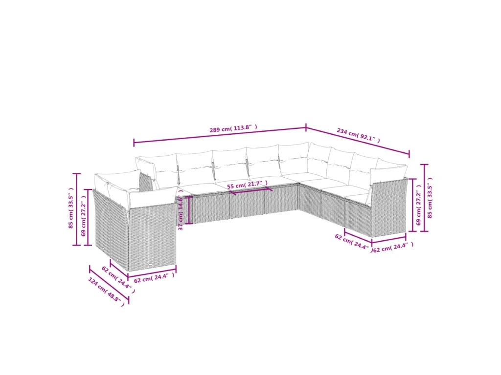 - Celkové rozměry 8místné pohovky: 289 x 234 x 69 cm (Š x H x V)