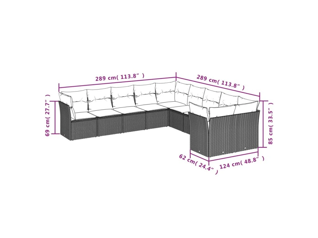 - Celkové rozměry pohovky: 289 x 289 x 69 cm (Š x H x V)