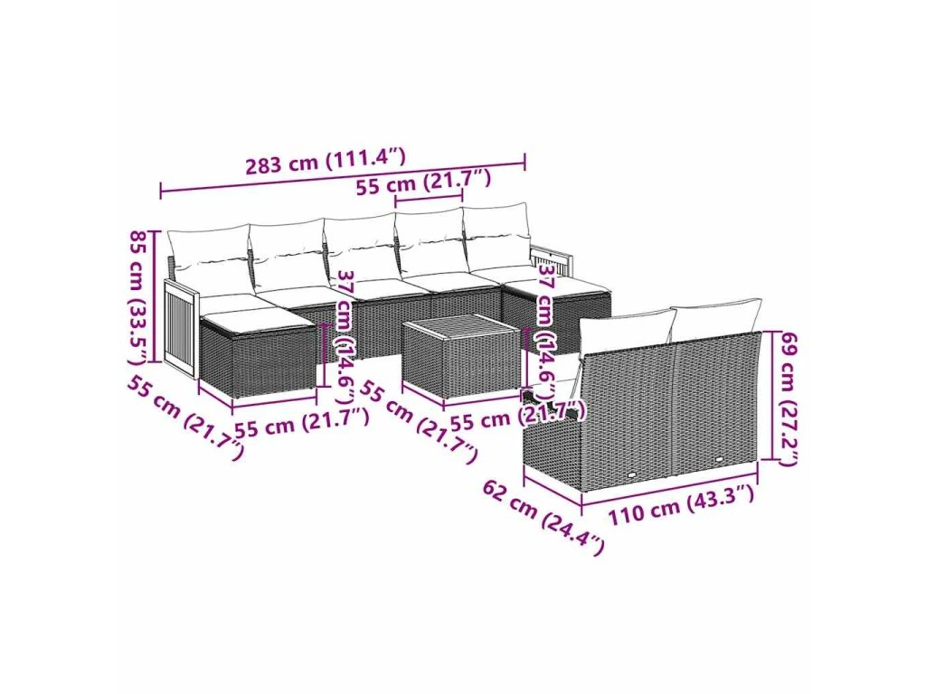 Tato zahradní sedací souprava je dokonalým doplňkem vaší zahrady, terasy nebo dvorku a poskytne vám pohodlné a příjemné místo, kde si můžete povídat s rodinou a přáteli nebo jen tak odpočívat a užívat si pobyt venku.