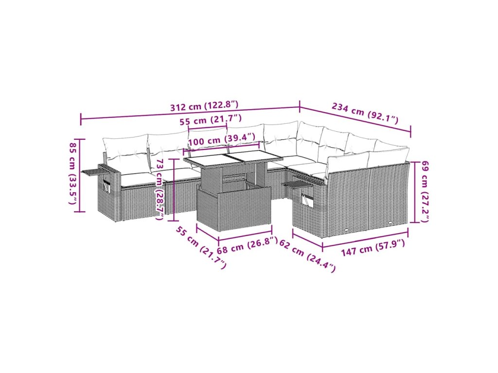 Tato zahradní sedací souprava je dokonalým doplňkem vaší zahrady, terasy nebo dvorku a poskytne vám pohodlné a příjemné místo, kde si můžete povídat s rodinou a přáteli nebo jen tak odpočívat a užívat si pobyt venku.