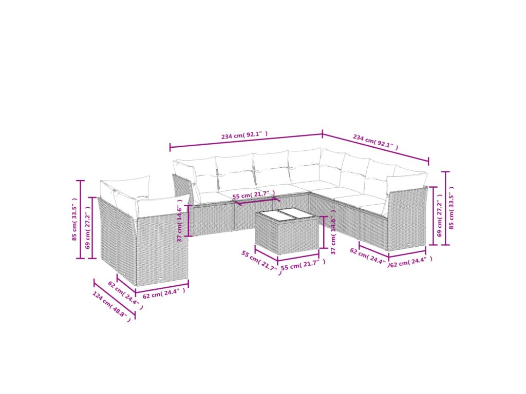 - Celkové rozměry 7místné pohovky: 234 x 234 x 69 cm (Š x H x V)