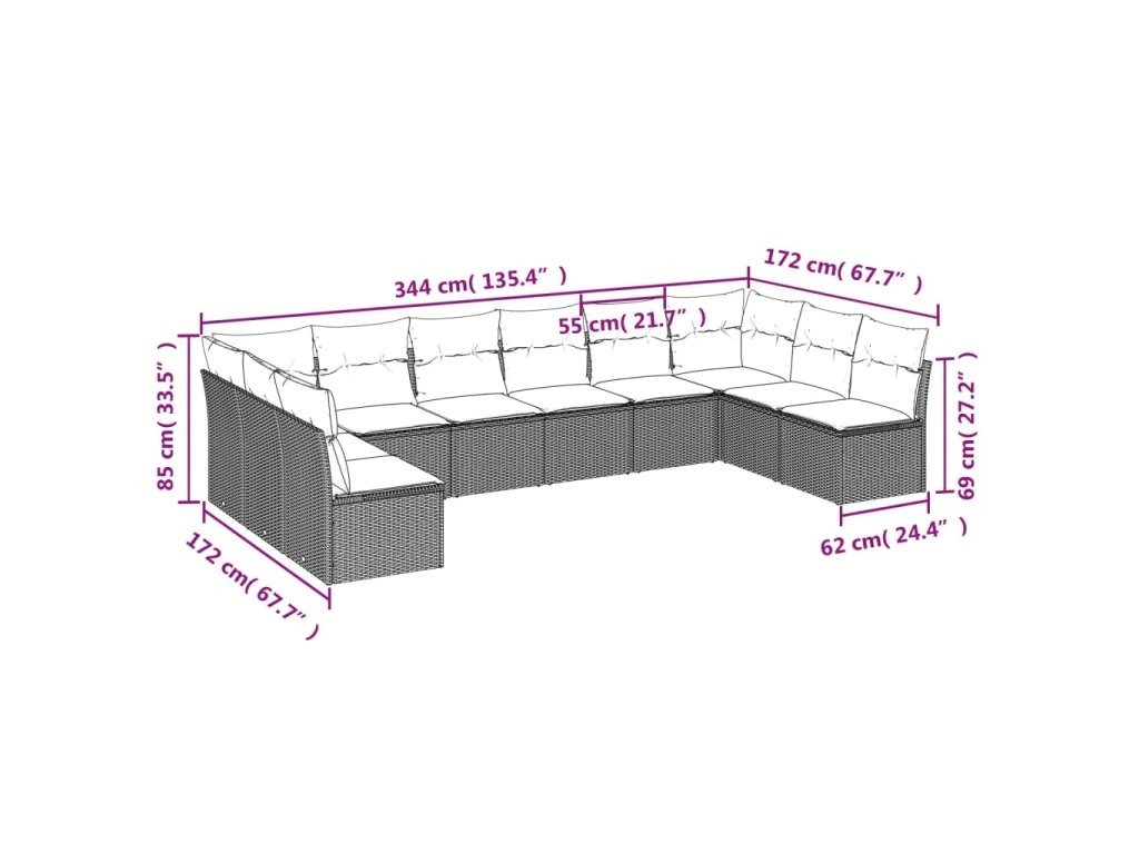 - Celkové rozměry pohovky: 344 x 172 x 69 cm (Š x H x V)