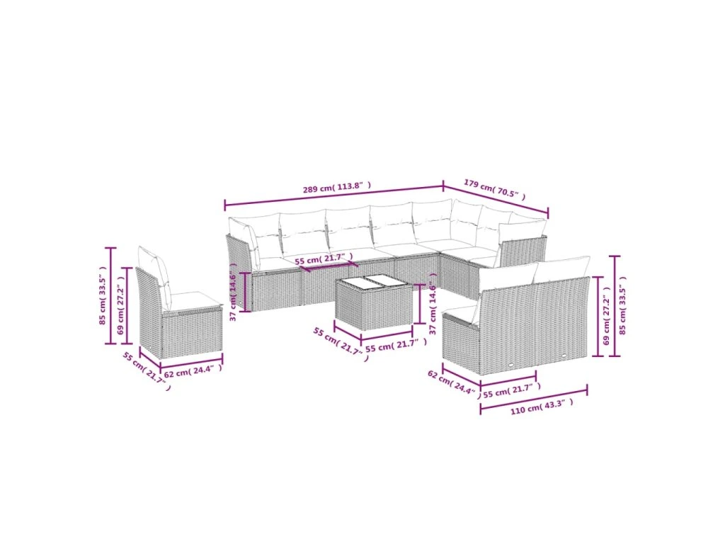 - Celkové rozměry 7místné pohovky: 289 x 179 x 69 cm (Š x H x V)