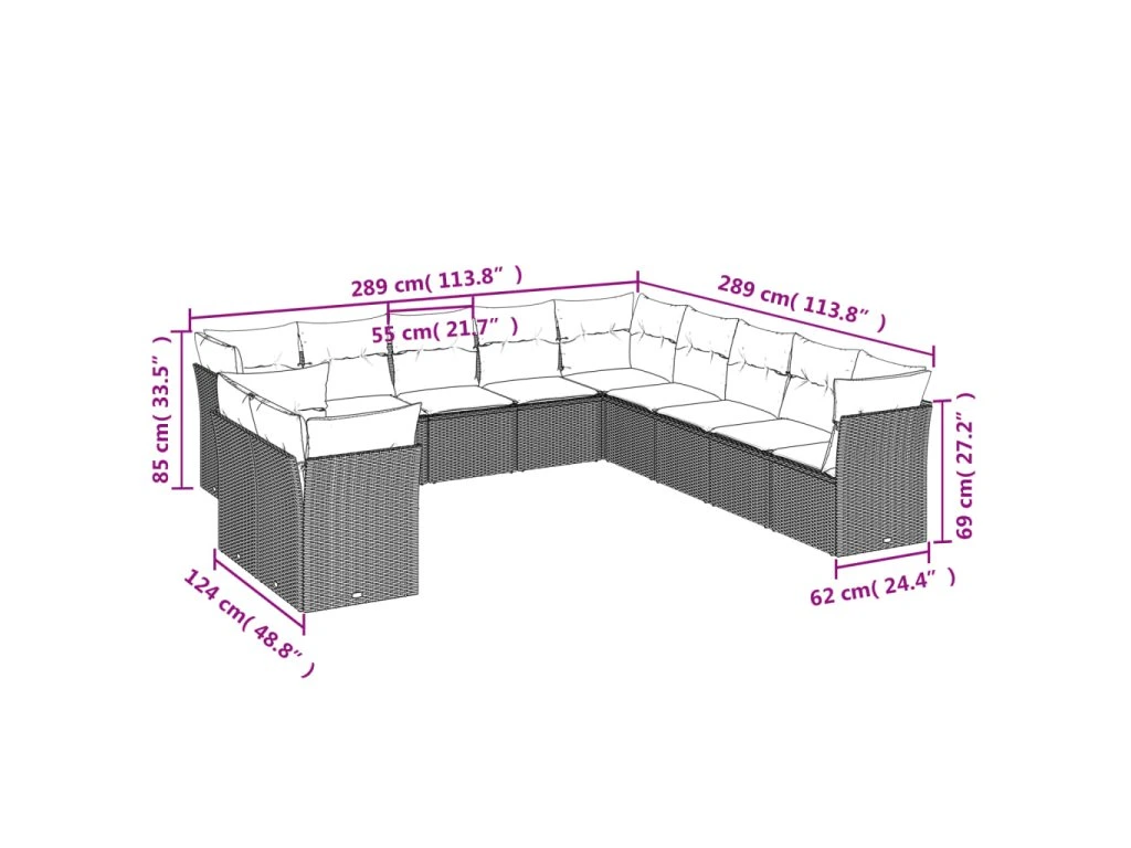 - Celkové rozměry 9místné pohovky: 289 x 289 x 69 cm (Š x H x V)