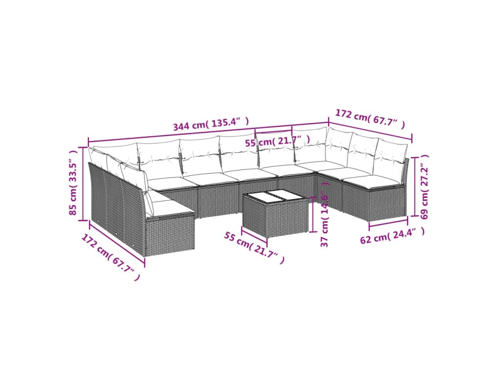 - Celkové rozměry pohovky: 344 x 172 x 69 cm (Š x H x V)