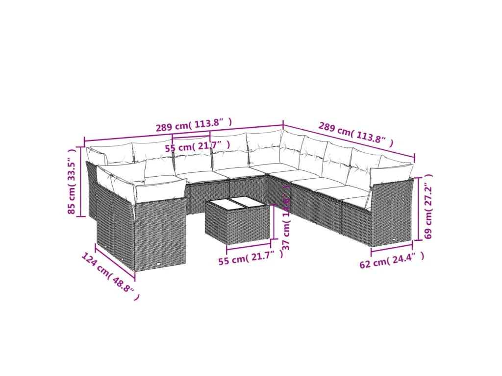 - Celkové rozměry 9místné pohovky: 289 x 289 x 69 cm (Š x H x V)