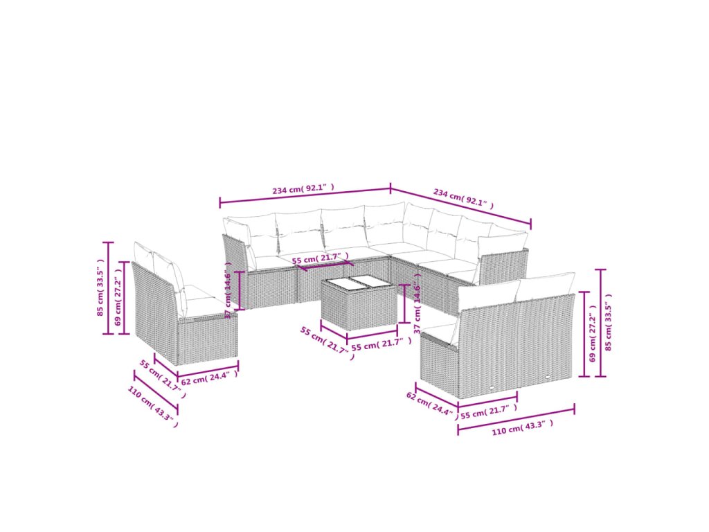 - Celkové rozměry 7místné pohovky: 234 x 234 x 69 cm (Š x H x V)