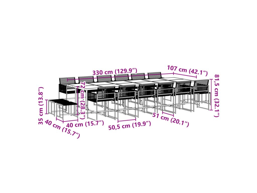 - Rozměry: 330 x 107 x 72 cm (D x Š x V)