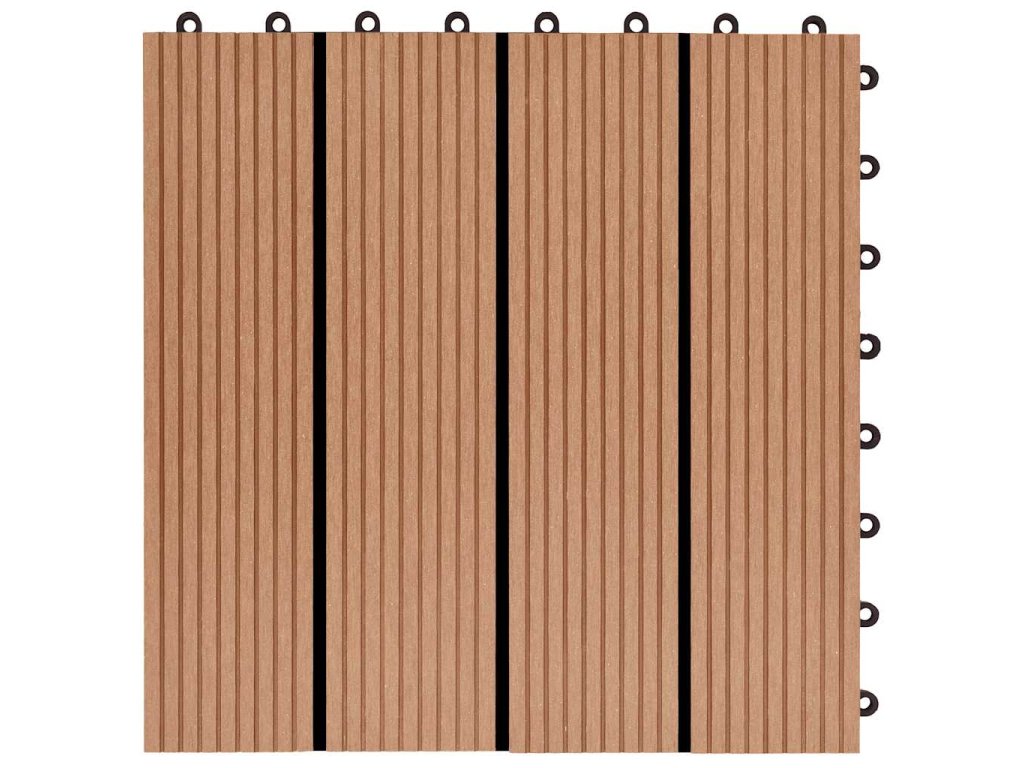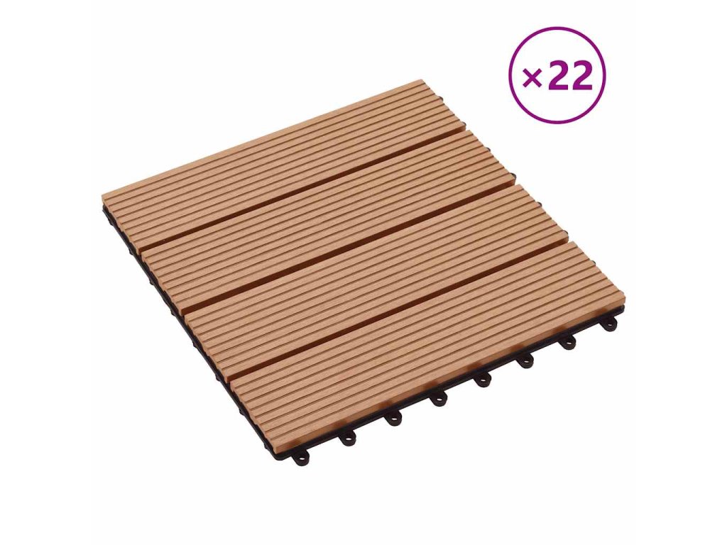 Tuto sadu terasových dlaždic z dřevoplastu tvoří 22 kusů samostatných dlaždic o velikosti 30 x 30 cm, které dohromady pokryjí celkový povrch o rozloze 2 metry čtverečné. Jsou ideální volbou na dvorky a balkony, k bazénu nebo k vířivce anebo třeba do koupelen.