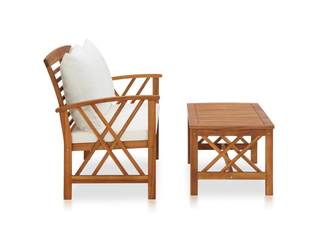Set zahradního nábytku je zhotovený z masivního akáciového dřeva s olejovou úpravou, je stabilní a má dlouhou životnost. Konferenční stolek z masivní dřevěnou stolní deskou s lamelovým designem poslouží jako perfektní odkládací plocha pro vaše občerstvení, mísy s ovocem, dekorativní předměty a další nezbytnosti. Podušky na sedák a polštář za záda přispívají k pohodlnému posezení, stejně jako opěradlo a loketní opěrky. Jak stůl, tak lavička mají dvojitý kříž na obou stranách.