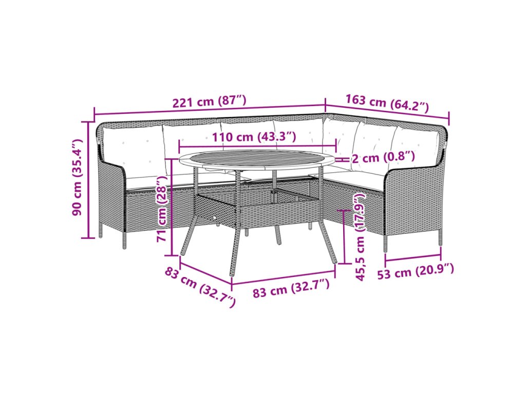 Tato zahradní sedací souprava je dokonalým doplňkem vaší zahrady, terasy nebo dvorku a poskytne vám pohodlné a příjemné místo, kde si můžete povídat s rodinou a přáteli nebo jen tak odpočívat a užívat si pobyt venku.