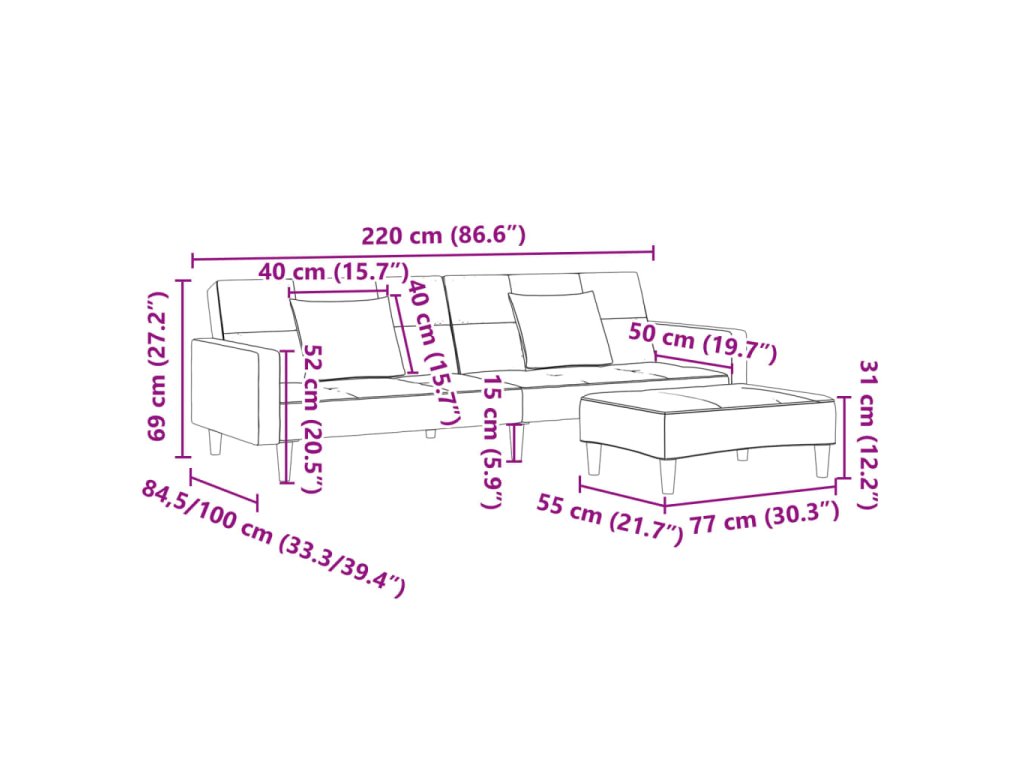 - Celkové rozměry: 220 x 84,5 x 69 cm (D x Š x V)