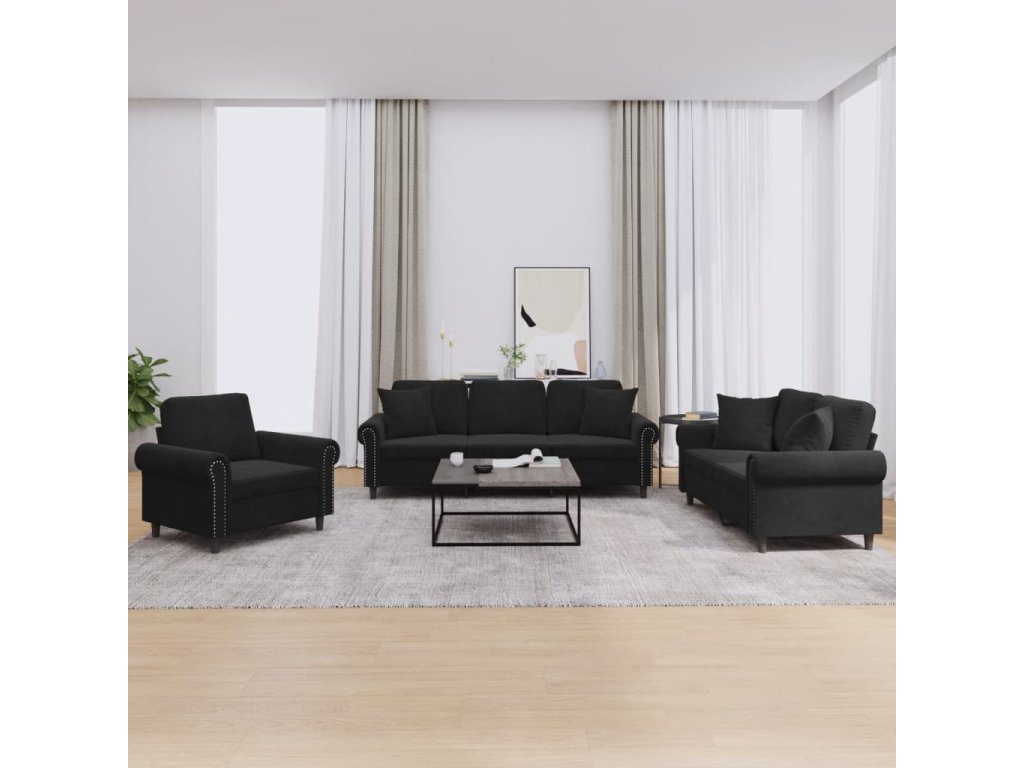 3dílná sedací souprava s polštáři černá samet 3202195