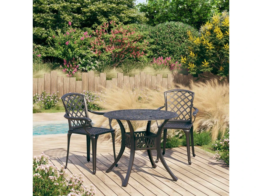 Zahradní stůl a židle z litého hliníku jsou robustní a hodně toho vydrží. Jelikož jsou vyrobené z materiálu, který nerezaví a nepodléhá klimatickým vlivům, jedná se o ideální nábytek pro venkovní použití. Vzhledem ke svému překrásnému designu zapůsobí bistro set ve vašem venkovním bydlení jako elegantní doplněk. Konferenční stolek má navíc uprostřed otvor, kam můžete zasunout slunečník, abyste se ochránili před sluníčkem či deštěm.