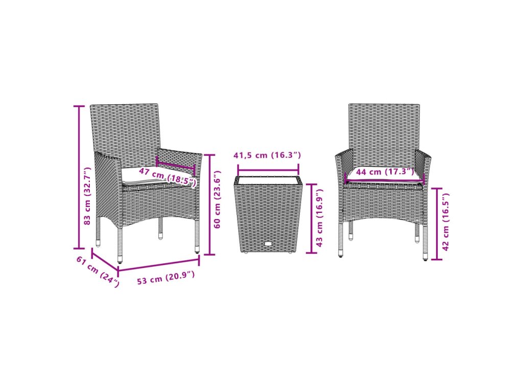 3dílný bistro set s poduškami černý polyratan a sklo 3278739