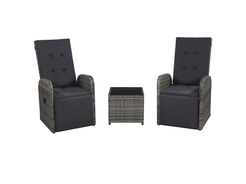 Nastavitelné opěradlo a podnožka polohovacích křesel vám umožní se pohodlně usadit a zcela se uvolnit. Tato sada venkovního nábytku je vyrobená z PE ratanu, který je odolný vůči klimatickým vlivům, snadno čistí, je velmi trvanlivý a vhodný pro každodenní použití. Ocelový rám s práškovým nástřikem je zárukou, že jsou křesla i stůl velmi pevné a odolné. Stůl má skleněnou horní desku. Polohovací židle vám poskytnou veškeré pohodlí, jaké si můžete přát. Opěradlo lze sklopit zatažením za tlačítko na boční straně křesla. Lehká konstrukce umožňuje snadné přesouvání nábytku. Součástí setu jsou rovněž mimořádně pohodlné, silně polstrované podušky na sedáky, jež se postarají o vaše naprosté pohodlí. Polyesterové potahy jsou nenáročné na údržbu a lze je také sejmout a oprat.