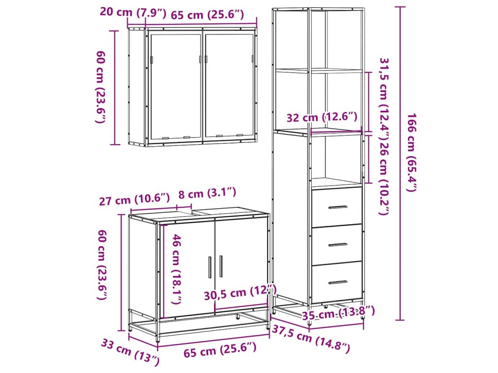 - Rozměry koupelnové skříňky: 35 x 37,5 x 166 cm (D x Š x V)