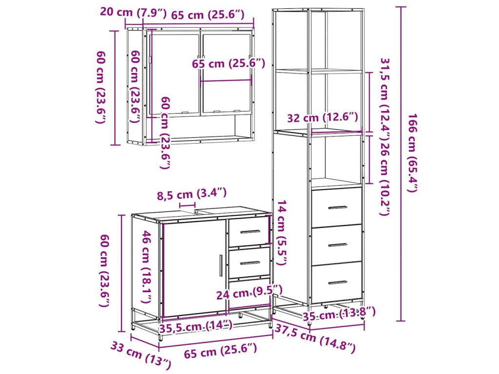 - Rozměry koupelnové skříňky: 35 x 37,5 x 166 cm (D x Š x V)