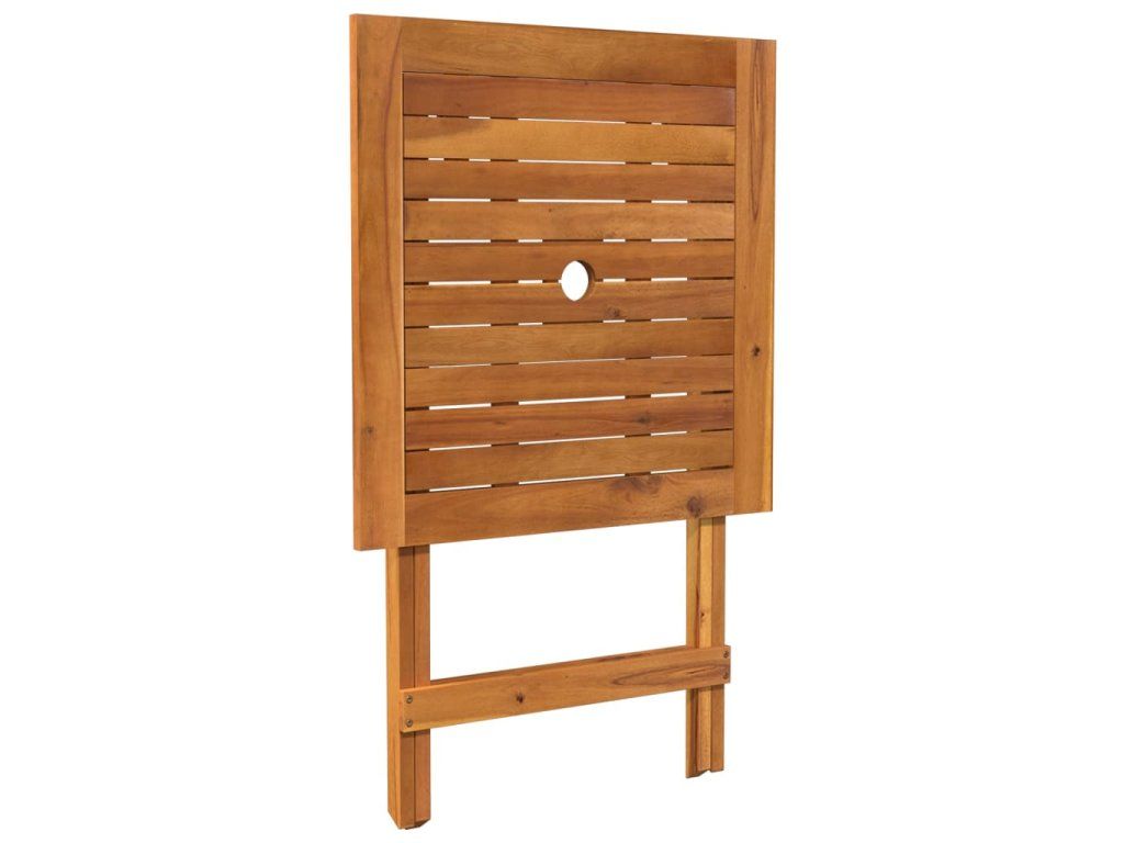 Tento jídelní set je vyrobený z masivního akáciového dřeva, je robustní a stabilní. Olejem napuštěný povrch nábytku snadno vyčistíte navlhčeným hadříkem. Jak jídelní stůl, tak i židle je možné složit, aby zbytečně nepřekážely, když je zrovna nepoužíváte.