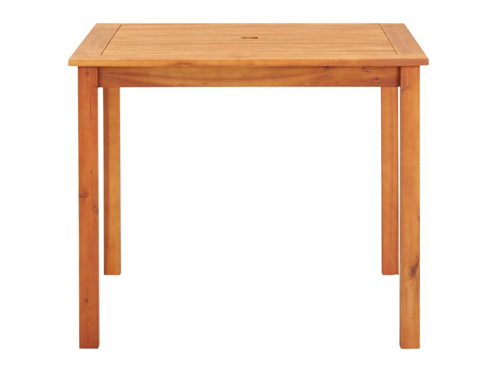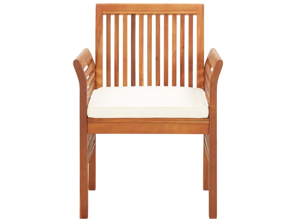 Stůl a židle s laťkovým designem jsou vyrobené z masivního akáciového dřeva s olejovou povrchovou úpravou, které je klimaticky odolné a vhodné pro venkovní použití. Olejem napuštěný povrch se také snadno čistí. Měkké podušky na sedácích vám při odpočinku na čerstvém vzduchu zaručí pohodlí. Když set nepoužíváte, můžete ho zakrýt nebo uložit, abyste prodloužili jeho životnost.