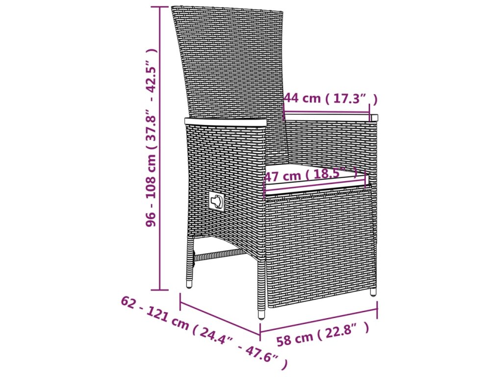 - Rozměry sklopeného křesla: 58 x 121 x 96 cm (Š x H x V)