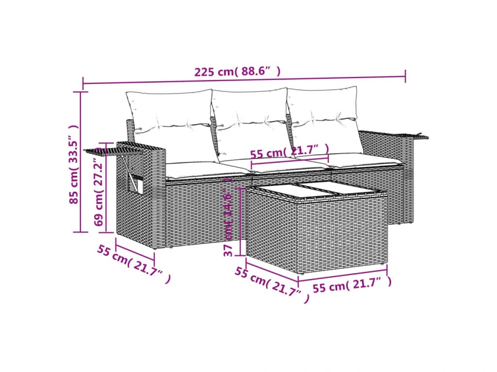 Tato zahradní sedací souprava je dokonalým doplňkem vaší zahrady, terasy nebo dvorku a poskytne vám pohodlné a příjemné místo, kde si můžete povídat s rodinou a přáteli nebo jen tak odpočívat a užívat si pobyt venku.