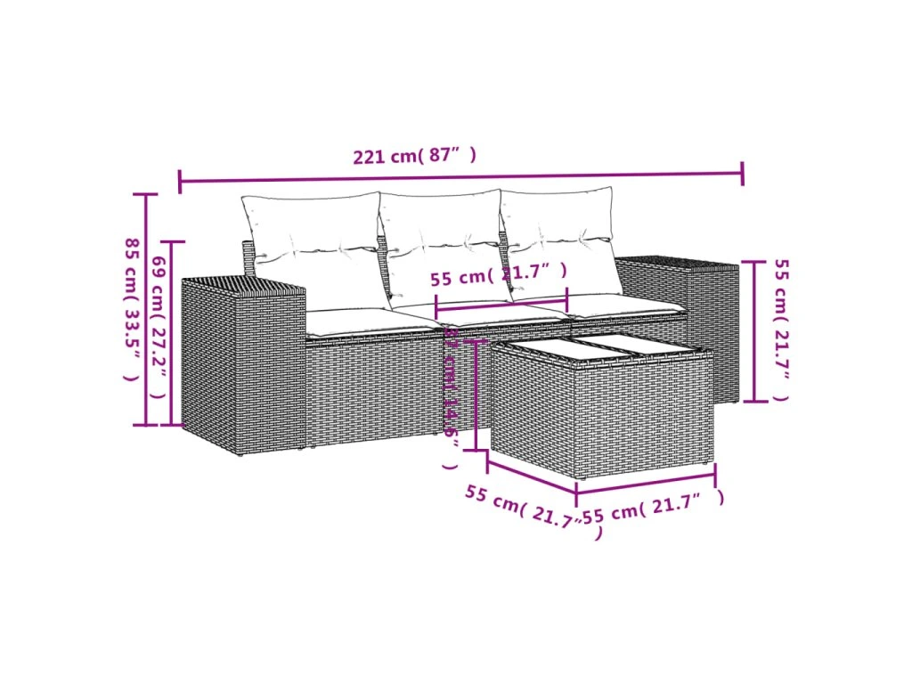 Tato zahradní sedací souprava je dokonalým doplňkem vaší zahrady, terasy nebo dvorku a poskytne vám pohodlné a příjemné místo, kde si můžete povídat s rodinou a přáteli nebo jen tak odpočívat a užívat si pobyt venku.