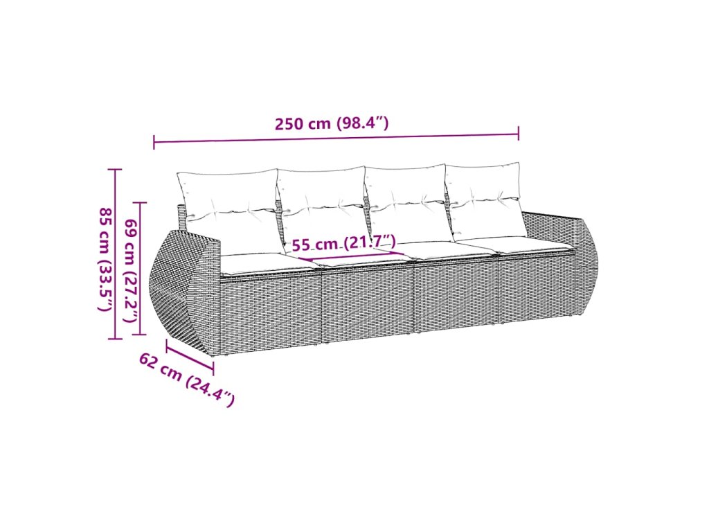 Tato zahradní sedací souprava je dokonalým doplňkem vaší zahrady, terasy nebo dvorku a poskytne vám pohodlné a příjemné místo, kde si můžete povídat s rodinou a přáteli nebo jen tak odpočívat a užívat si pobyt venku.