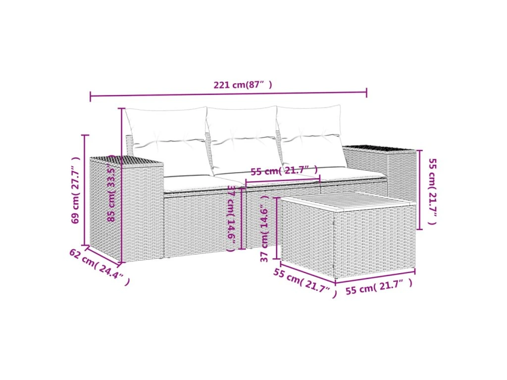 Tato zahradní sedací souprava je dokonalým doplňkem vaší zahrady, terasy nebo dvorku a poskytne vám pohodlné a příjemné místo, kde si můžete povídat s rodinou a přáteli nebo jen tak odpočívat a užívat si pobyt venku.