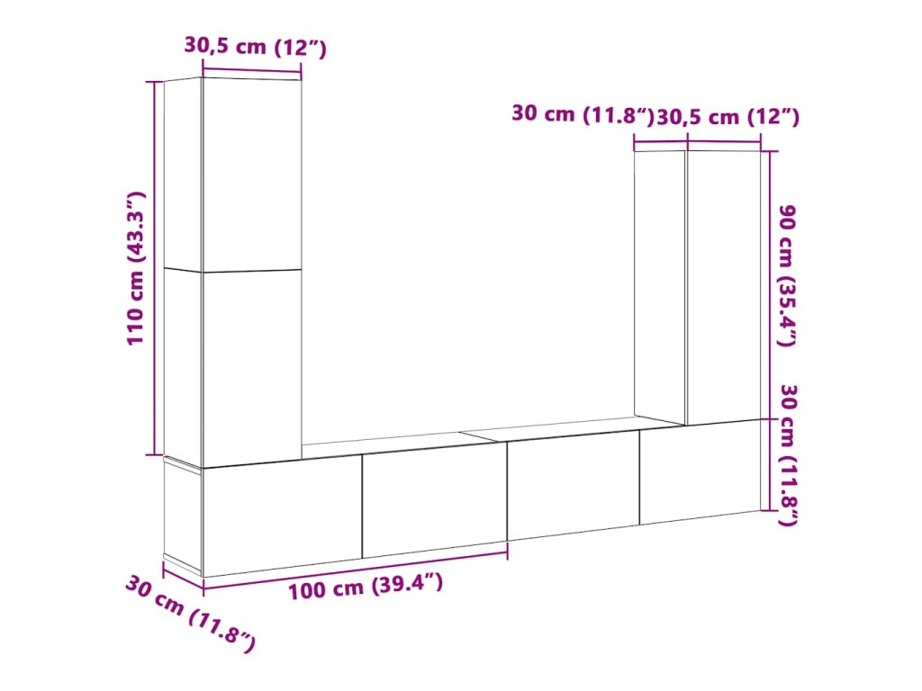 - 1x TV skříňka: 30,5 x 30 x 110 cm (D x Š x V)