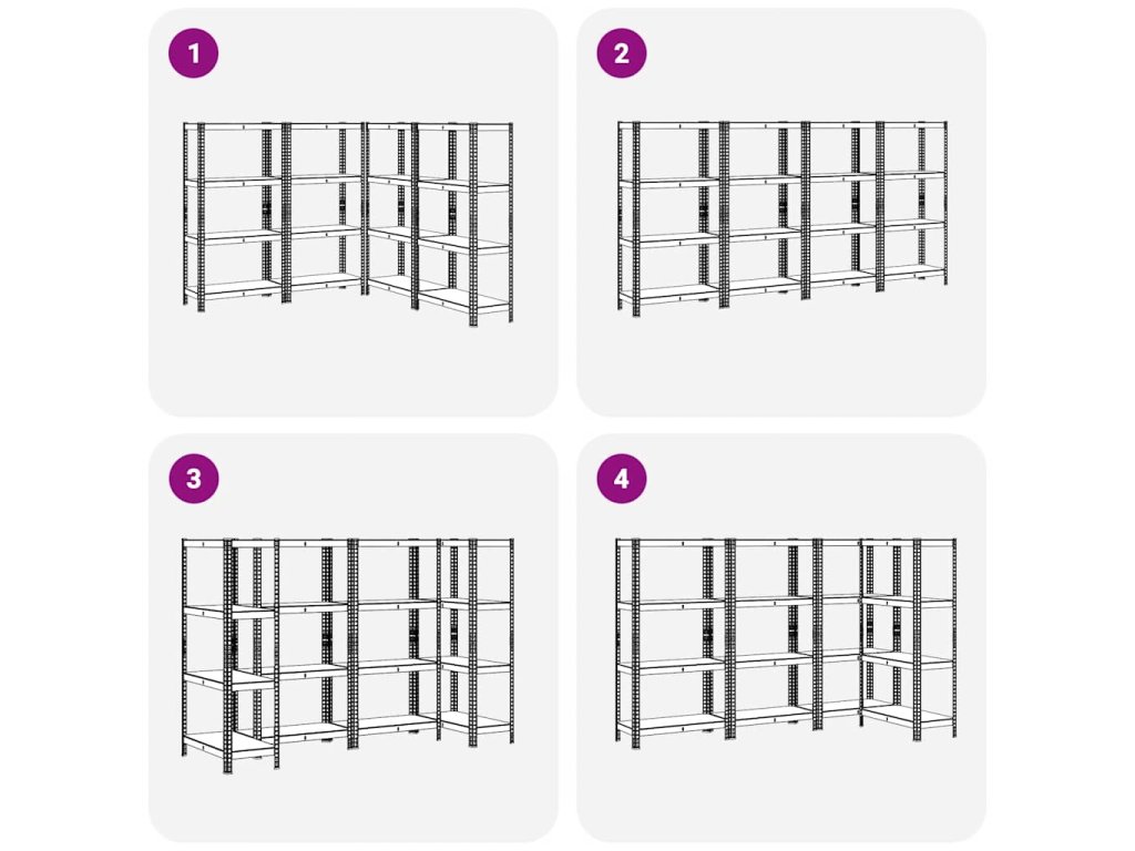 - Silná nosnost: Díky silnému materiálu, výztužné tyči pod každou policí a bezšroubovému provedení má tento garážový regál velkou nosnost.