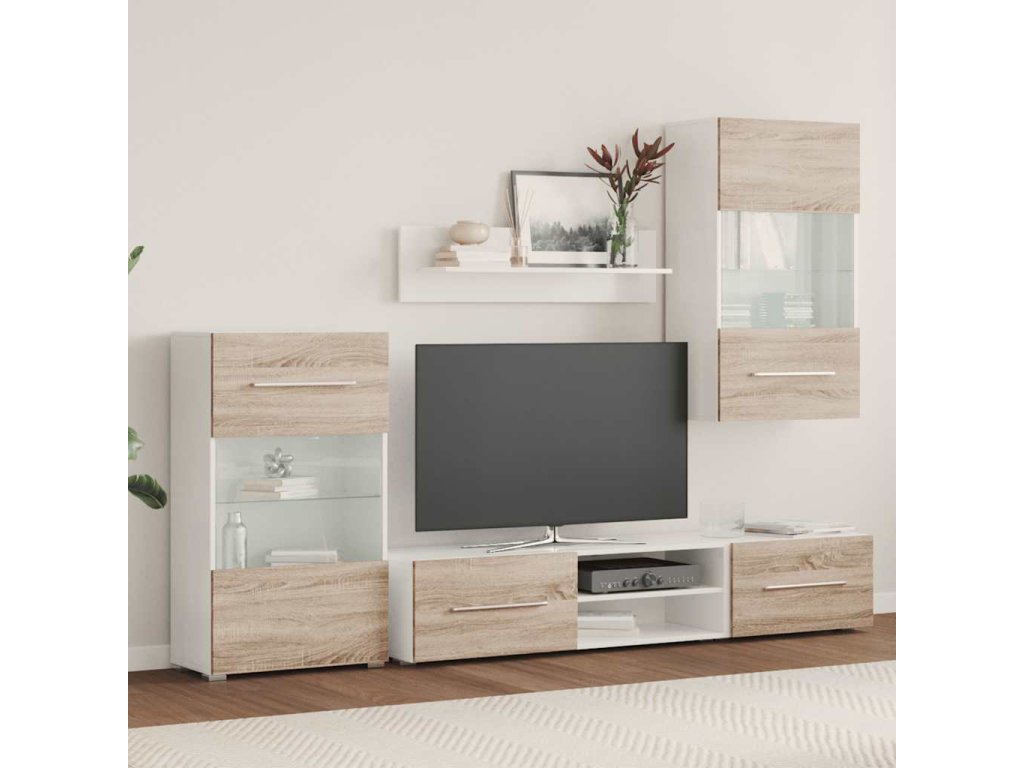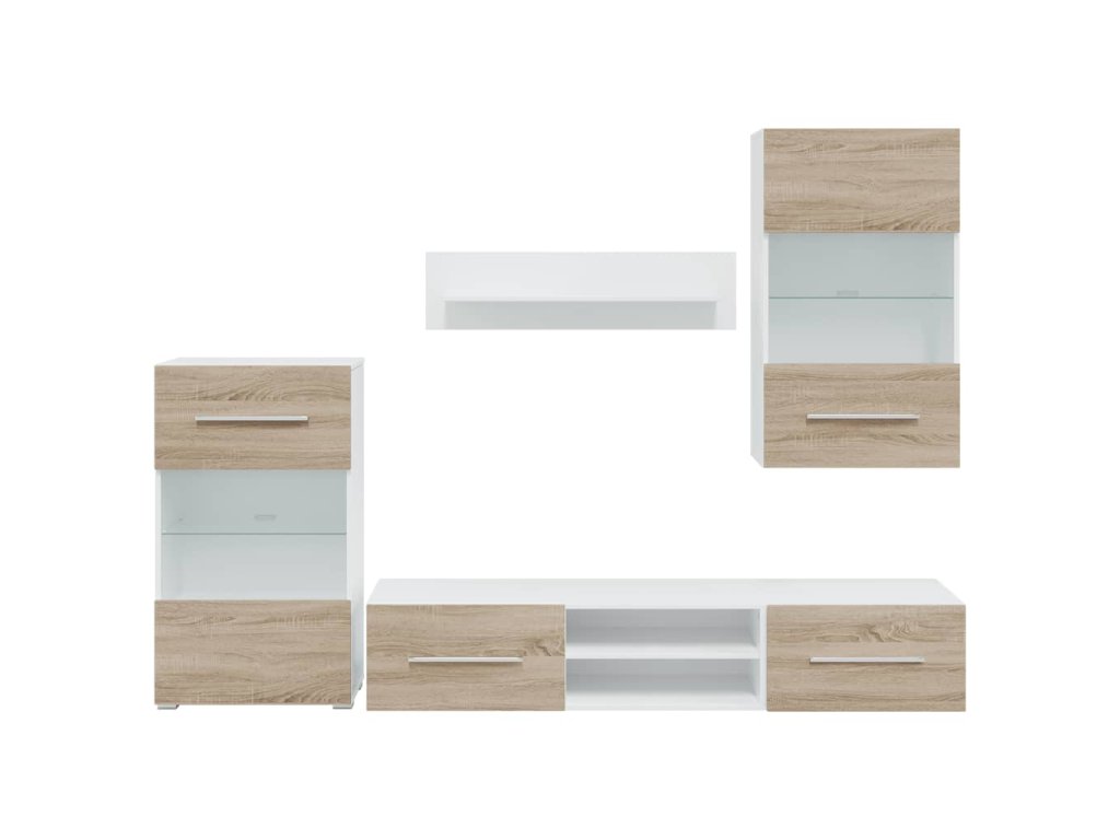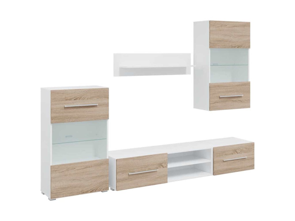 - Dostatek úložného prostoru: Sada obsahuje nástěnnou skříňku, stojící skříňku, dvě nízké desky a nástěnnou polici. Nabízí univerzální úložný prostor pro multimediální zařízení, knihy a menší předměty a zároveň poskytuje prostor pro dekorativní vitríny.