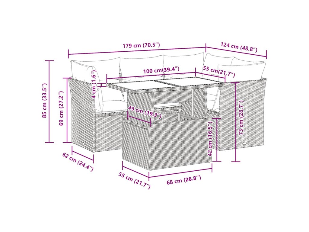 Tato zahradní sedací souprava je dokonalým doplňkem vaší zahrady, terasy nebo dvorku a poskytne vám pohodlné a příjemné místo, kde si můžete povídat s rodinou a přáteli nebo jen tak odpočívat a užívat si pobyt venku.