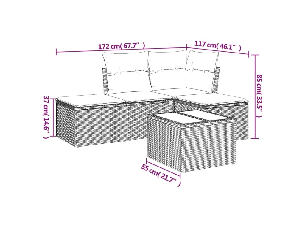 Tato zahradní sedací souprava je dokonalým doplňkem vaší zahrady, terasy nebo dvorku a poskytne vám pohodlné a příjemné místo, kde si můžete povídat s rodinou a přáteli nebo jen tak odpočívat a užívat si pobyt venku.