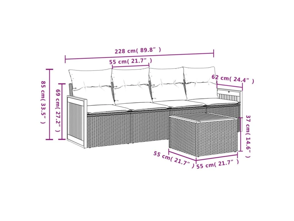Tato zahradní sedací souprava je dokonalým doplňkem vaší zahrady, terasy nebo dvorku a poskytne vám pohodlné a příjemné místo, kde si můžete povídat s rodinou a přáteli nebo jen tak odpočívat a užívat si pobyt venku.