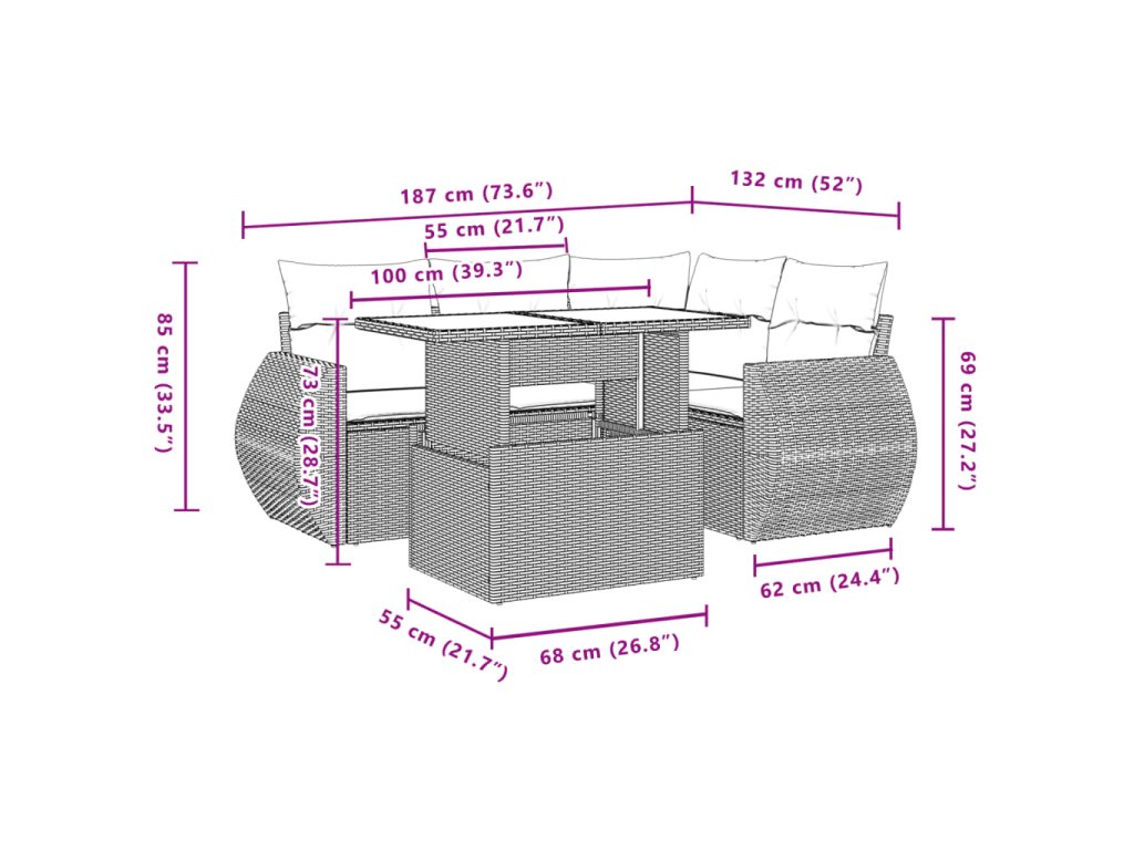 Tato zahradní sedací souprava je dokonalým doplňkem vaší zahrady, terasy nebo dvorku a poskytne vám pohodlné a příjemné místo, kde si můžete povídat s rodinou a přáteli nebo jen tak odpočívat a užívat si pobyt venku.