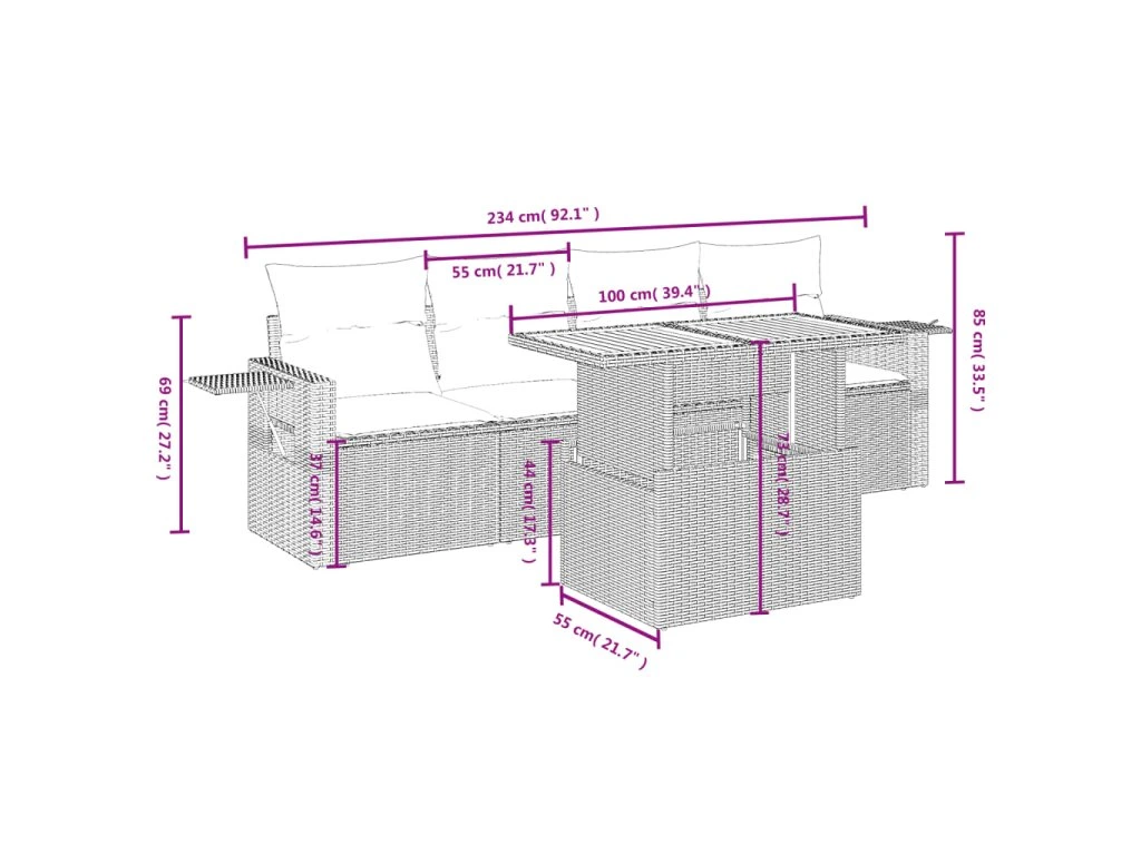 Tato zahradní sedací souprava je dokonalým doplňkem vaší zahrady, terasy nebo dvorku a poskytne vám pohodlné a příjemné místo, kde si můžete povídat s rodinou a přáteli nebo jen tak odpočívat a užívat si pobyt venku.
