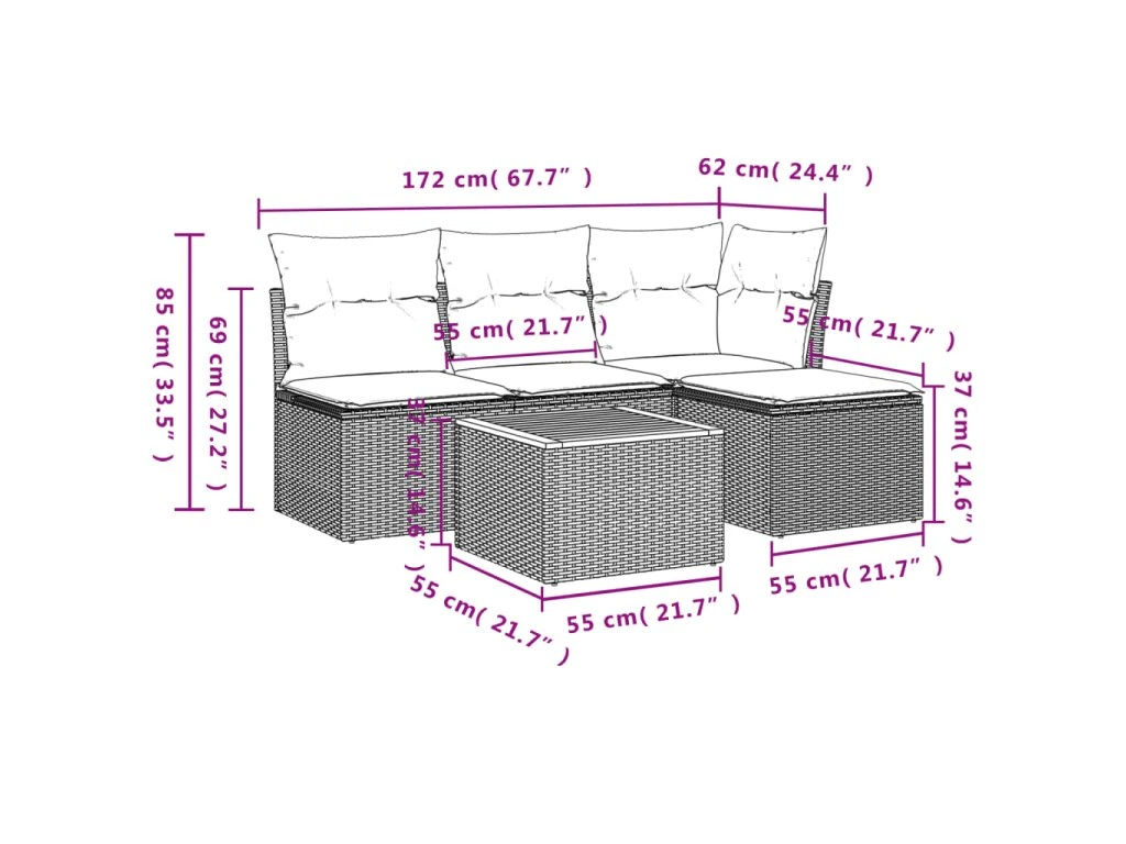 Tato zahradní sedací souprava je dokonalým doplňkem vaší zahrady, terasy nebo dvorku a poskytne vám pohodlné a příjemné místo, kde si můžete povídat s rodinou a přáteli nebo jen tak odpočívat a užívat si pobyt venku.