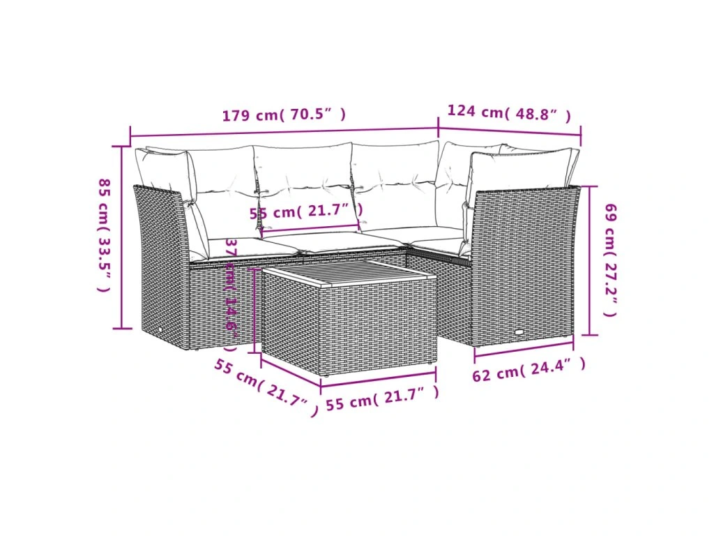 Tato zahradní sedací souprava je dokonalým doplňkem vaší zahrady, terasy nebo dvorku a poskytne vám pohodlné a příjemné místo, kde si můžete povídat s rodinou a přáteli nebo jen tak odpočívat a užívat si pobyt venku.