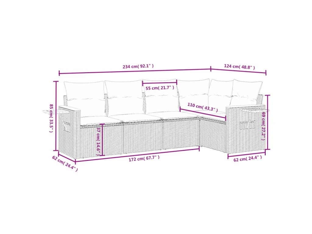 Tato zahradní sedací souprava je dokonalým doplňkem vaší zahrady, terasy nebo dvorku a poskytne vám pohodlné a příjemné místo, kde si můžete povídat s rodinou a přáteli nebo jen tak odpočívat a užívat si pobyt venku.