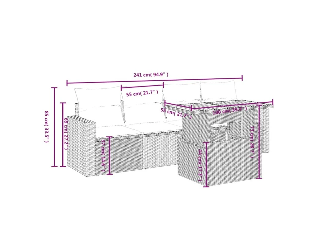 Tato zahradní sedací souprava je dokonalým doplňkem vaší zahrady, terasy nebo dvorku a poskytne vám pohodlné a příjemné místo, kde si můžete povídat s rodinou a přáteli nebo jen tak odpočívat a užívat si pobyt venku.