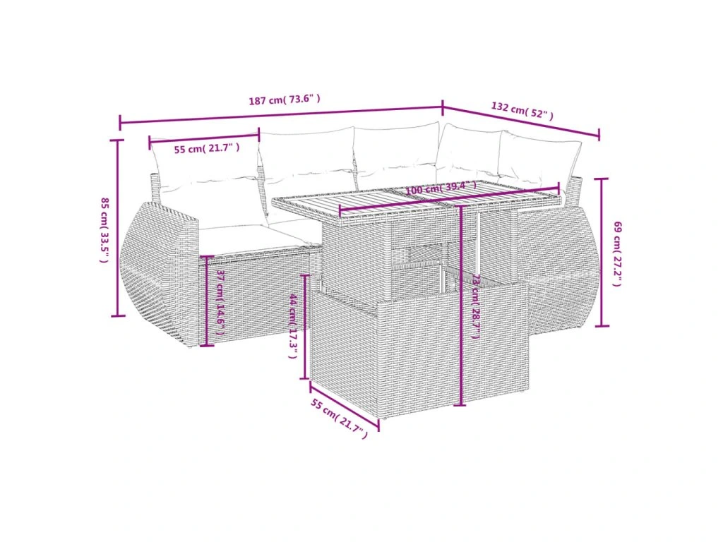 Tato zahradní sedací souprava je dokonalým doplňkem vaší zahrady, terasy nebo dvorku a poskytne vám pohodlné a příjemné místo, kde si můžete povídat s rodinou a přáteli nebo jen tak odpočívat a užívat si pobyt venku.