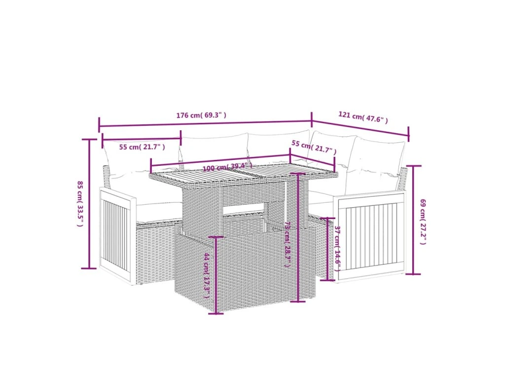 Tato zahradní sedací souprava je dokonalým doplňkem vaší zahrady, terasy nebo dvorku a poskytne vám pohodlné a příjemné místo, kde si můžete povídat s rodinou a přáteli nebo jen tak odpočívat a užívat si pobyt venku.