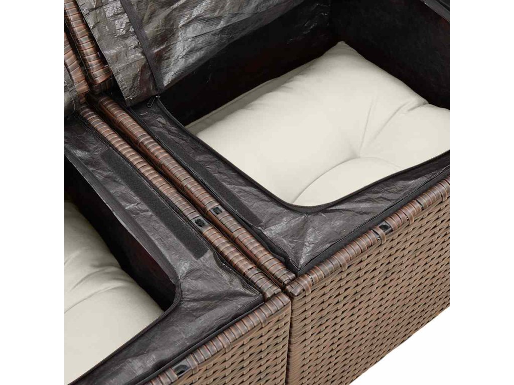 - Úložný prostor s voděodolným vakem: Každý zahradní sedací díl má úložný prostor pod sedákem, který je opatřen voděodolnou vložkou a poslouží vám k ukládání podušek, hraček a dalších věcí. Vnitřní vak má horní kryt a lze jej bezpečně připevnit k sedáku pomocí suchého zipu, což zaručí větší stabilitu.