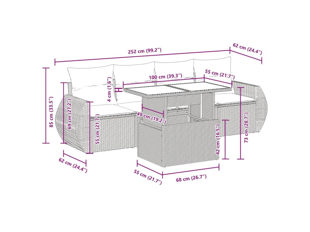 Tato zahradní sedací souprava je dokonalým doplňkem vaší zahrady, terasy nebo dvorku a poskytne vám pohodlné a příjemné místo, kde si můžete povídat s rodinou a přáteli nebo jen tak odpočívat a užívat si pobyt venku.