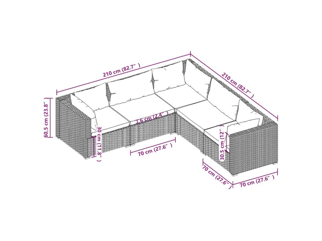 - Rozměry rohové/středové pohovky (každé): 70 x 70 x 60,5 cm (D x Š x V)