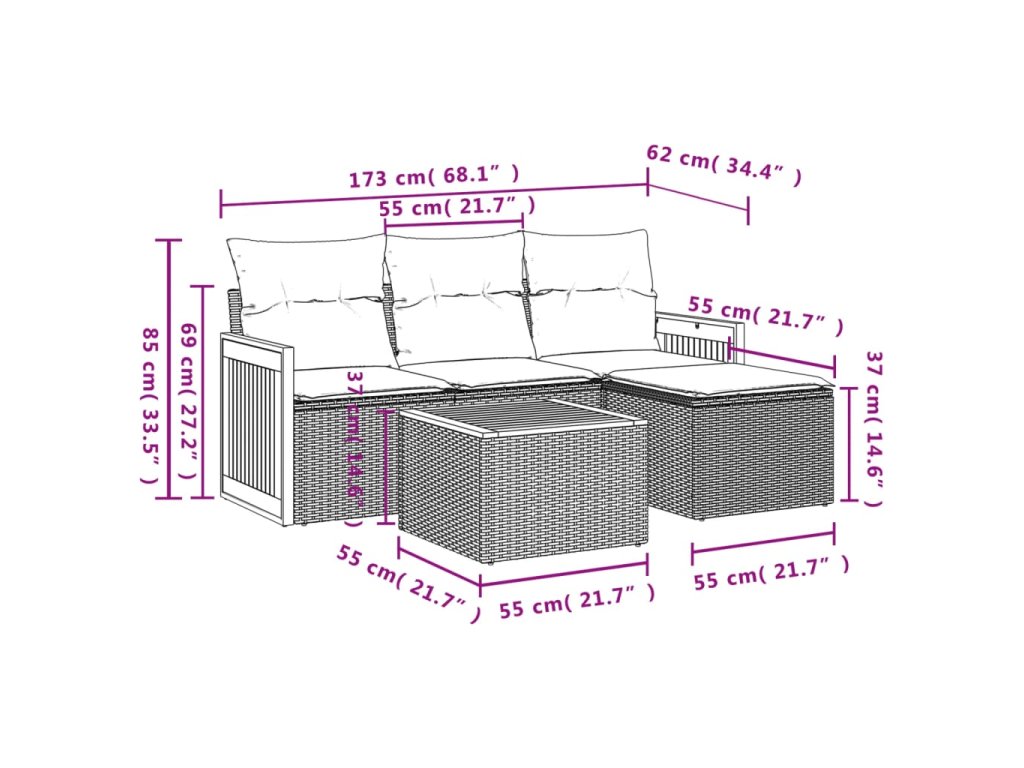 Tato zahradní sedací souprava je dokonalým doplňkem vaší zahrady, terasy nebo dvorku a poskytne vám pohodlné a příjemné místo, kde si můžete povídat s rodinou a přáteli nebo jen tak odpočívat a užívat si pobyt venku.