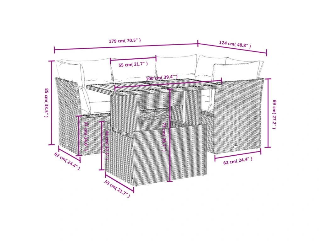 Tato zahradní sedací souprava je dokonalým doplňkem vaší zahrady, terasy nebo dvorku a poskytne vám pohodlné a příjemné místo, kde si můžete povídat s rodinou a přáteli nebo jen tak odpočívat a užívat si pobyt venku.